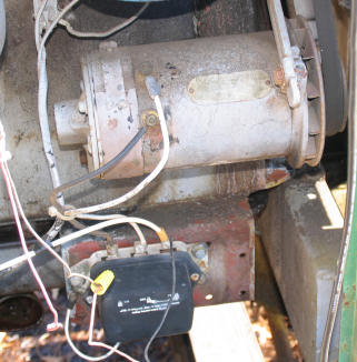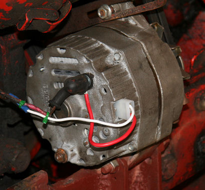 On this JD M, the "1" terminal is connected directly to the coil. The red wire got spliced to the green wire to the coil. The white "2" wire is connected to Battery lead. Note that the terminals are on the opposite side, compared to the picture above. Just remove the case screws and rotate to the desired alignment and put the screws back in. If the case separates, you get to fiddle with getting the brushes back in without breaking something. Avoid that. What you can't see here is that the green alternator has the proper moulded plug. These are available at most autoparts stores. Look in the section with the miscellaneous, springs, clips, knobs and things. The rebuilt alternator is usually under $60. Don't tell them it is for a Farmall or whatever... that just confuses them. The typical unit puts out around 65 amps, compared to around 20-30 amps for the old generator, so don't worry about the heavy duty stuff. |