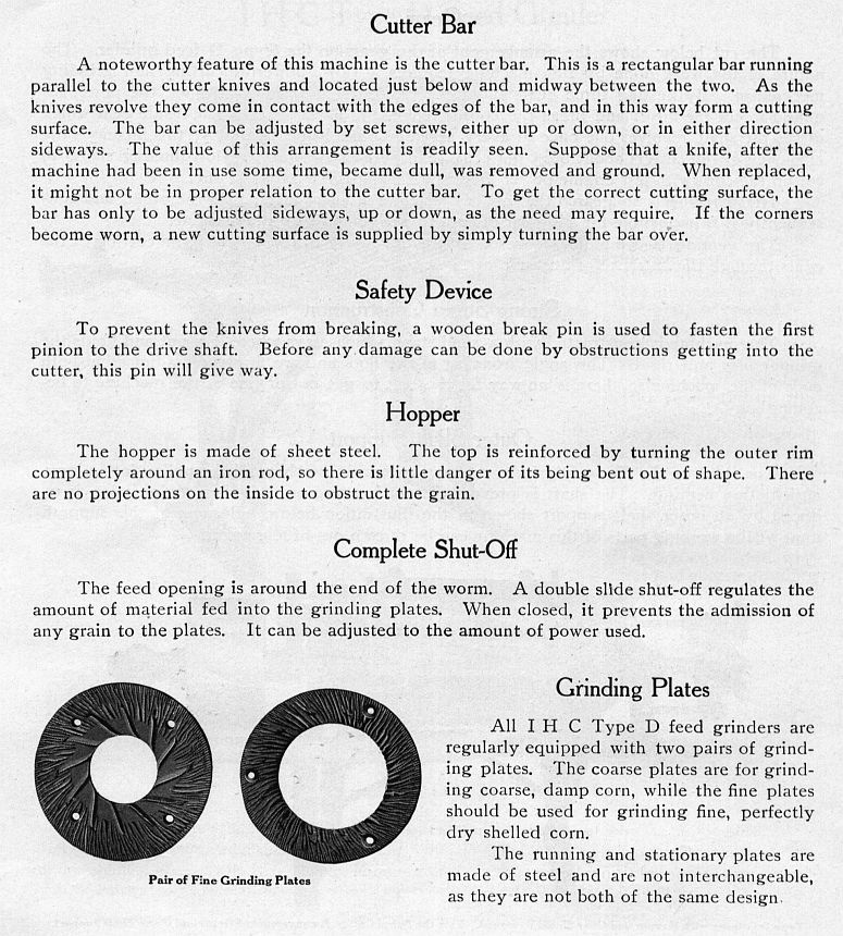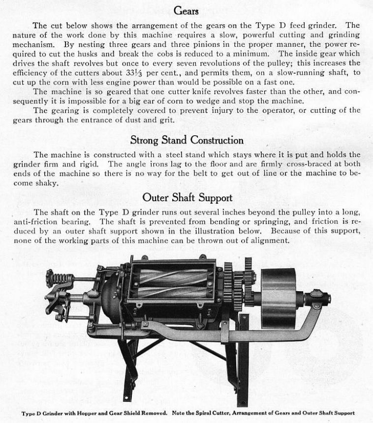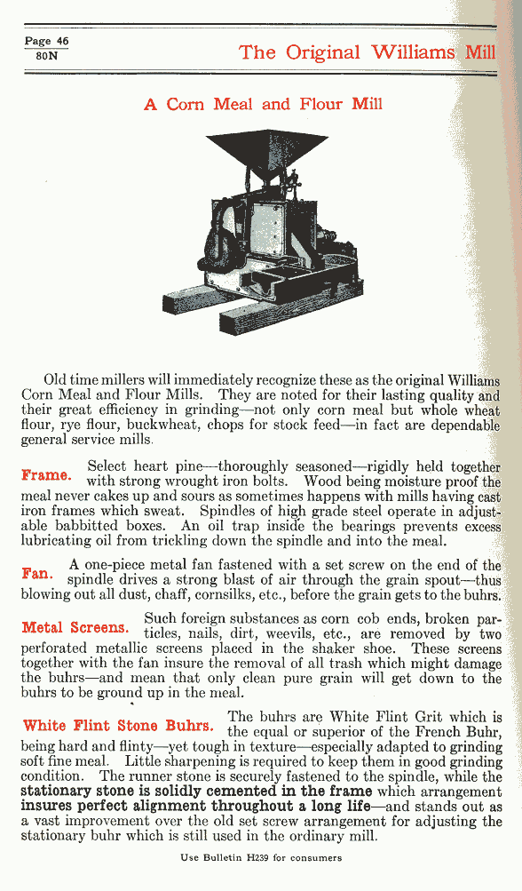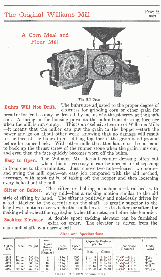 These specs on the Williams Mill come from Neal Collier's 1919 Fairbanks-Morse Catalog. We believe the mill, now located in Building 49, University of West Florida, to be a 30 inch Williams. We also have a rather large pdf file of the Williams Brochure provided by Ken Christison at Grist Millers dot com. |